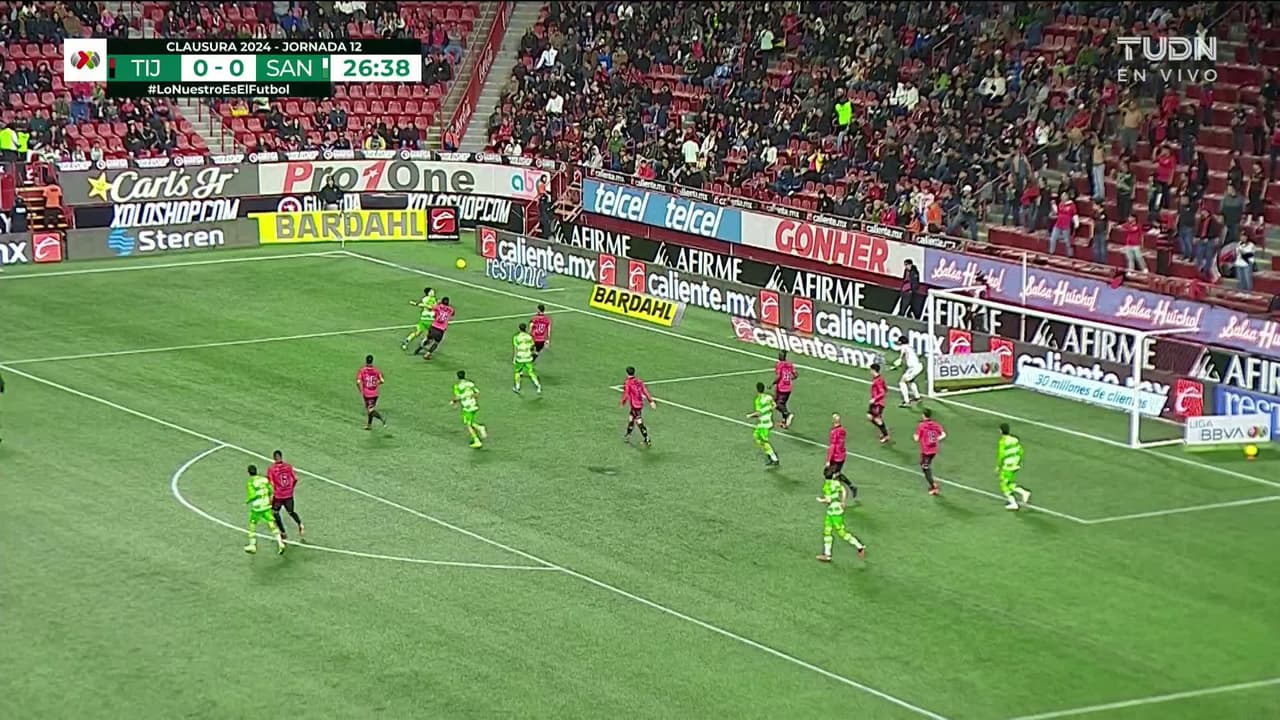 ¡Gol! Club Tijuana 0| Santos Laguna 1. Aldo López (Santos Laguna) disparo de cabeza desde muy cerca.