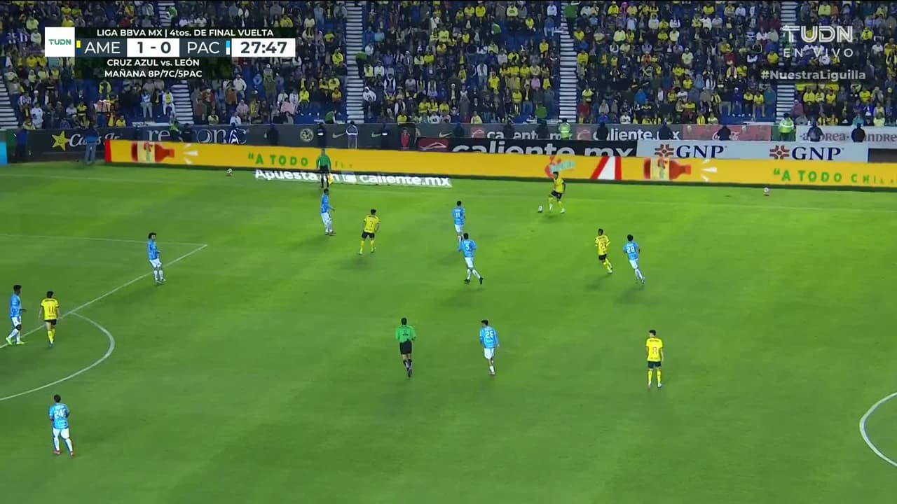 ¡Gol! América 2| Pachuca 0. Álex Zendejas (América) zurdazo sin ángulo desde la izquierda disparo rastrero| junto al palo izquierdo. Asistencia de Kevin Álvarez con un centro al área.