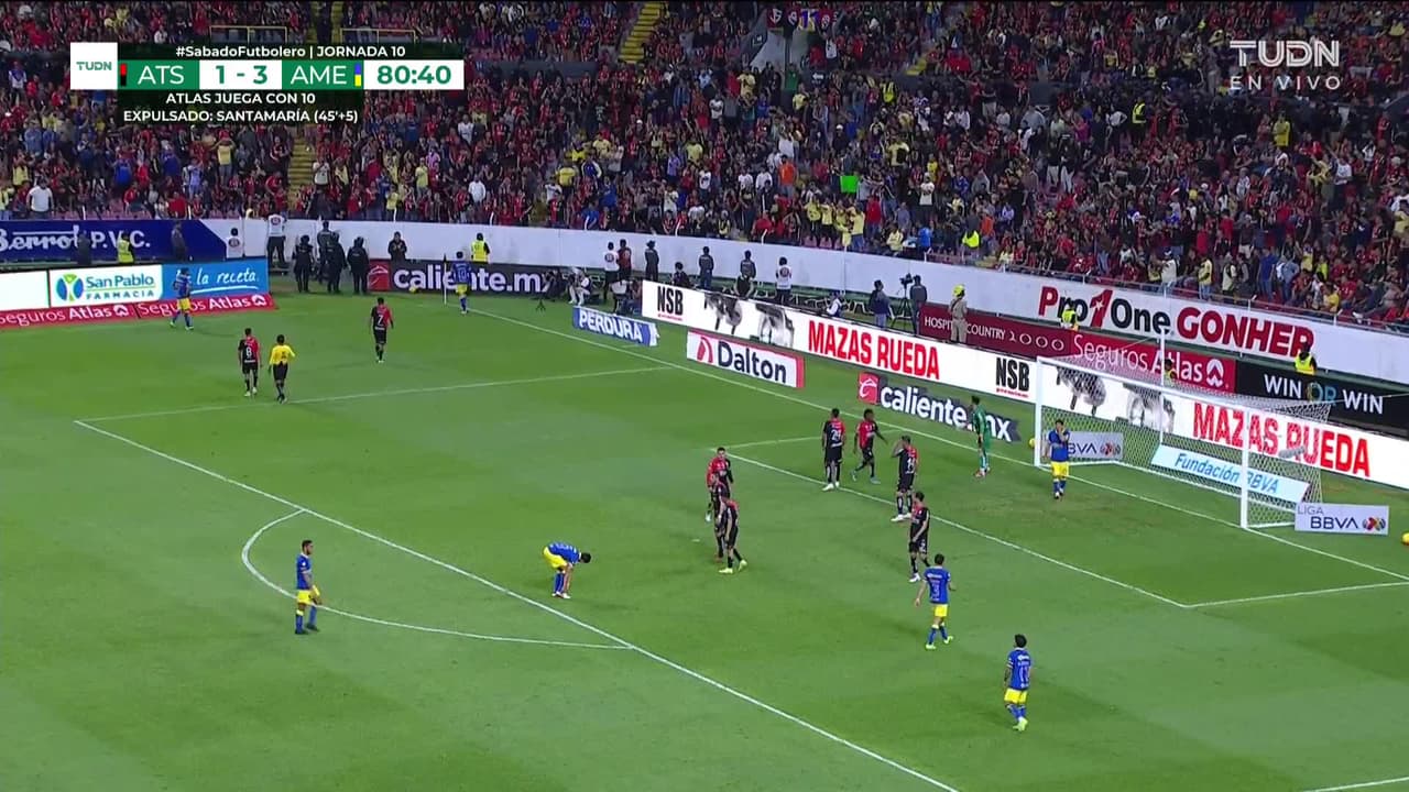 ¡Gol! Atlas 1| América 4. Álex Zendejas (América) zurdazo sin ángulo desde la derecha tras un saque de esquina.