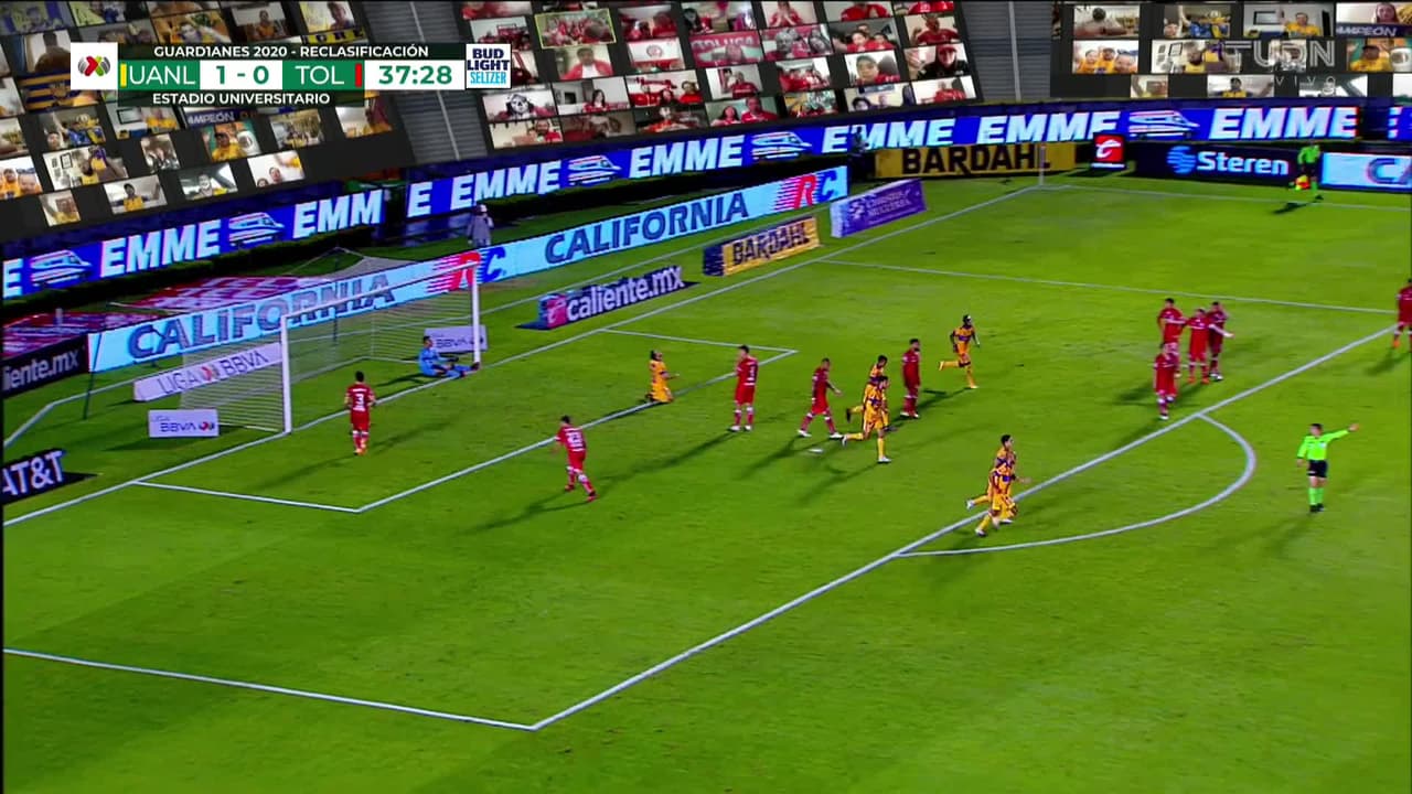 ¡Gol! Tigres 2| Toluca 0. André-Pierre Gignac (Tigres) marca de tiro libre directo| Disparo con la derecha por arriba.