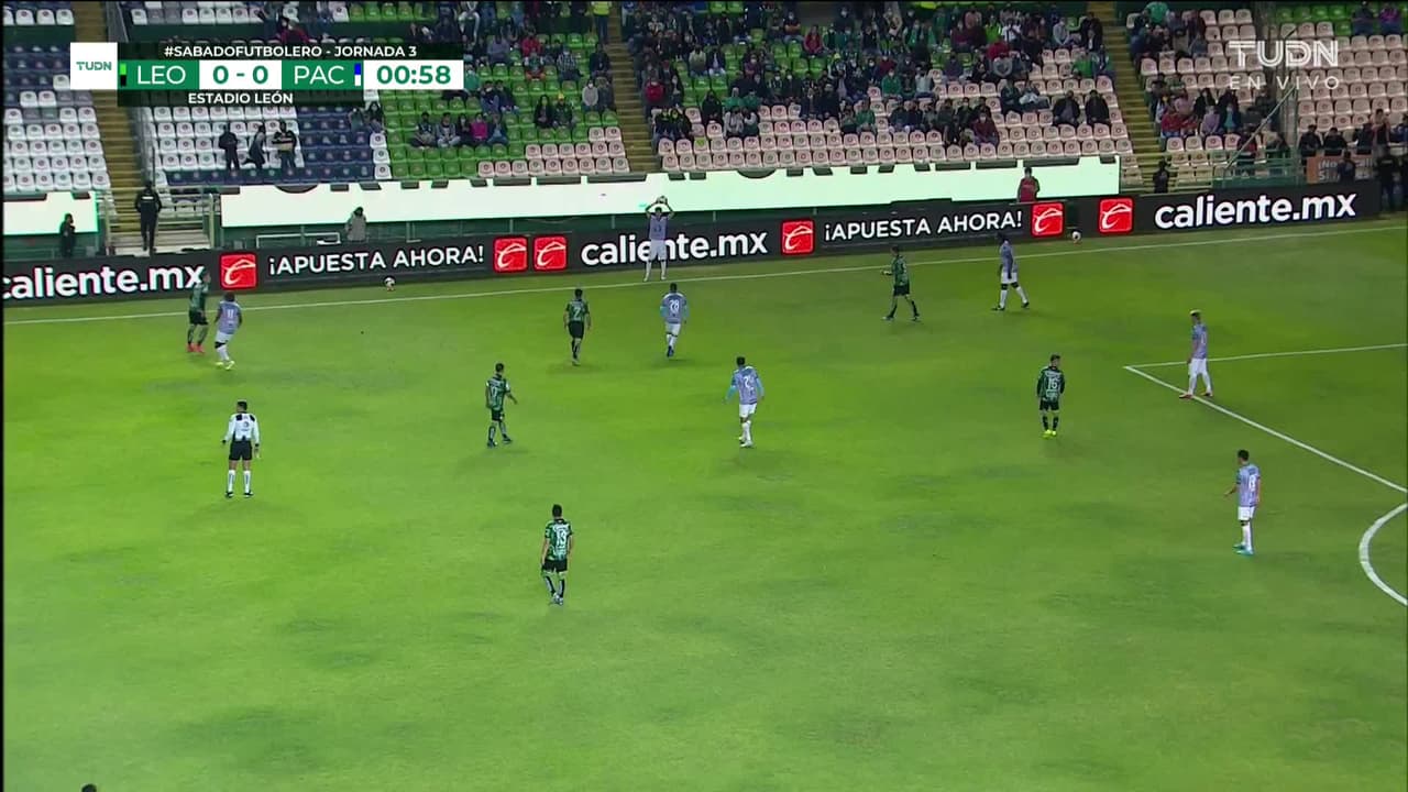 ¡Gol! León 1| Pachuca 0. Andrés Mosquera (León) Disparo con la derecha desde el lado derecho dentro del área.