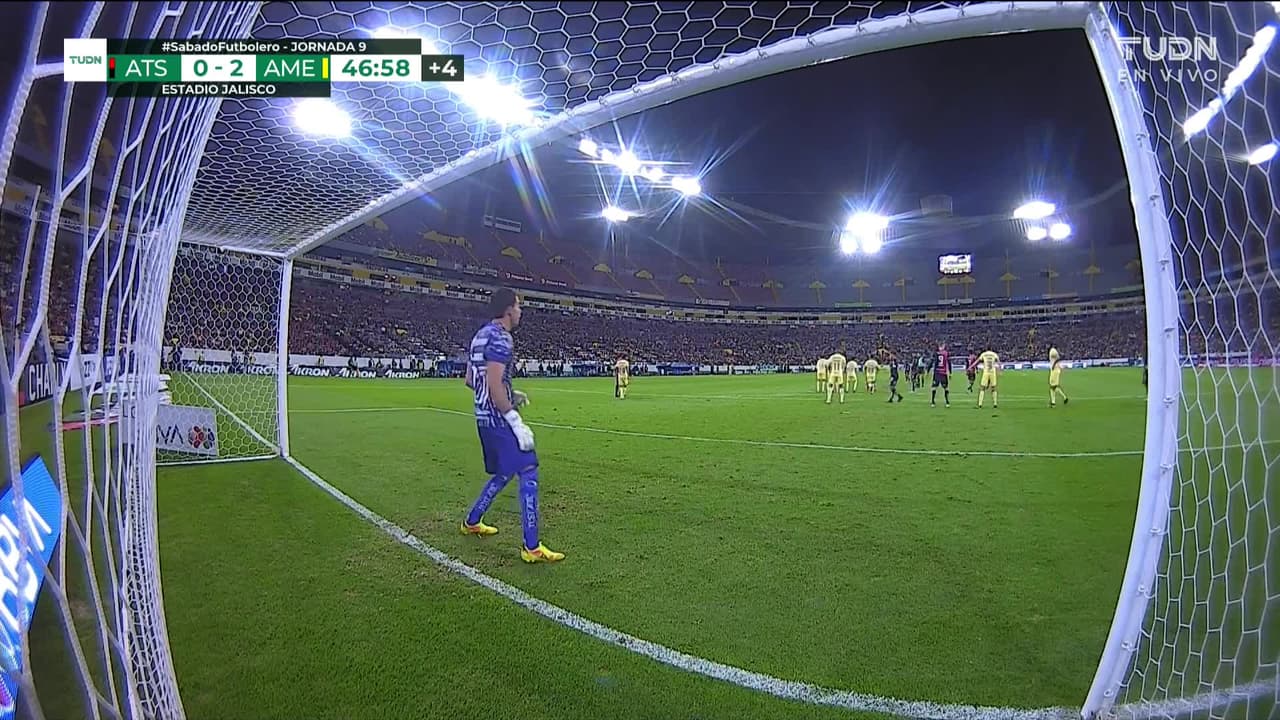 ¡Gol! Atlas 1| América 2. Brian Lozano (Atlas) marca de tiro libre directo| Disparo con la derecha.