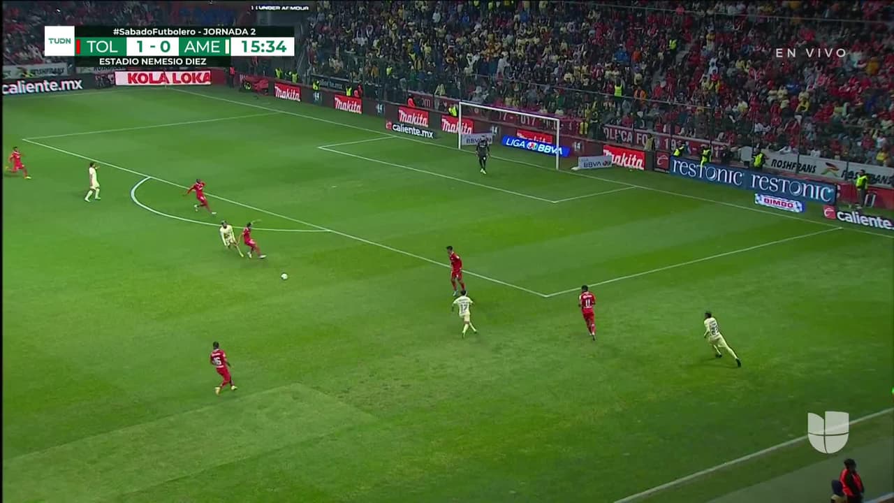 ¡Gol! Toluca 1| América 1. Brian Rodríguez (América) zurdazo desde el lado izquierdo dentro del área.