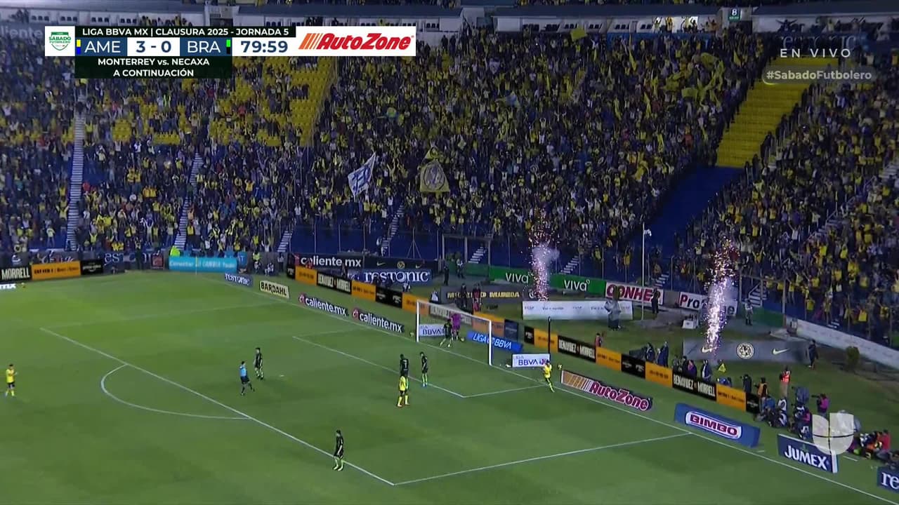 ¡Gol! América 4| FC Juárez 0. Brian Rodríguez (América) Disparo con la derecha desde el centro del área tras un contragolpe.