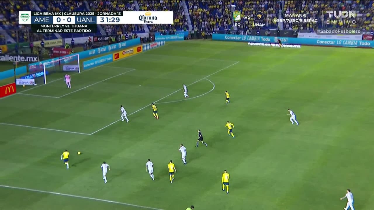 ¡Gol! América 1| Tigres 0. Brian Rodríguez (América) Disparo con la derecha desde el lado izquierdo dentro del área.