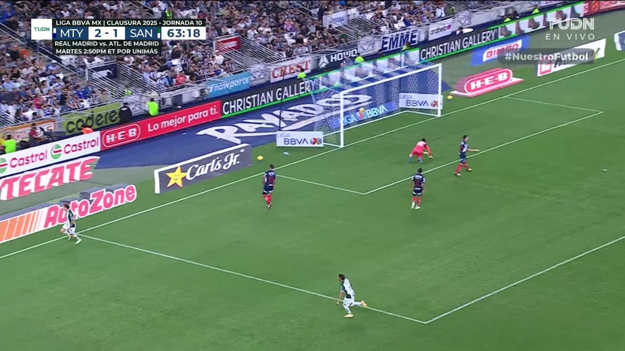 ¡Gol! Monterrey 2| Santos Laguna 2. Bruno Barticciotto (Santos Laguna) zurdazo desde el lado izquierdo dentro del área por el lado derecho de la portería. Asistencia de Fran Villalba.