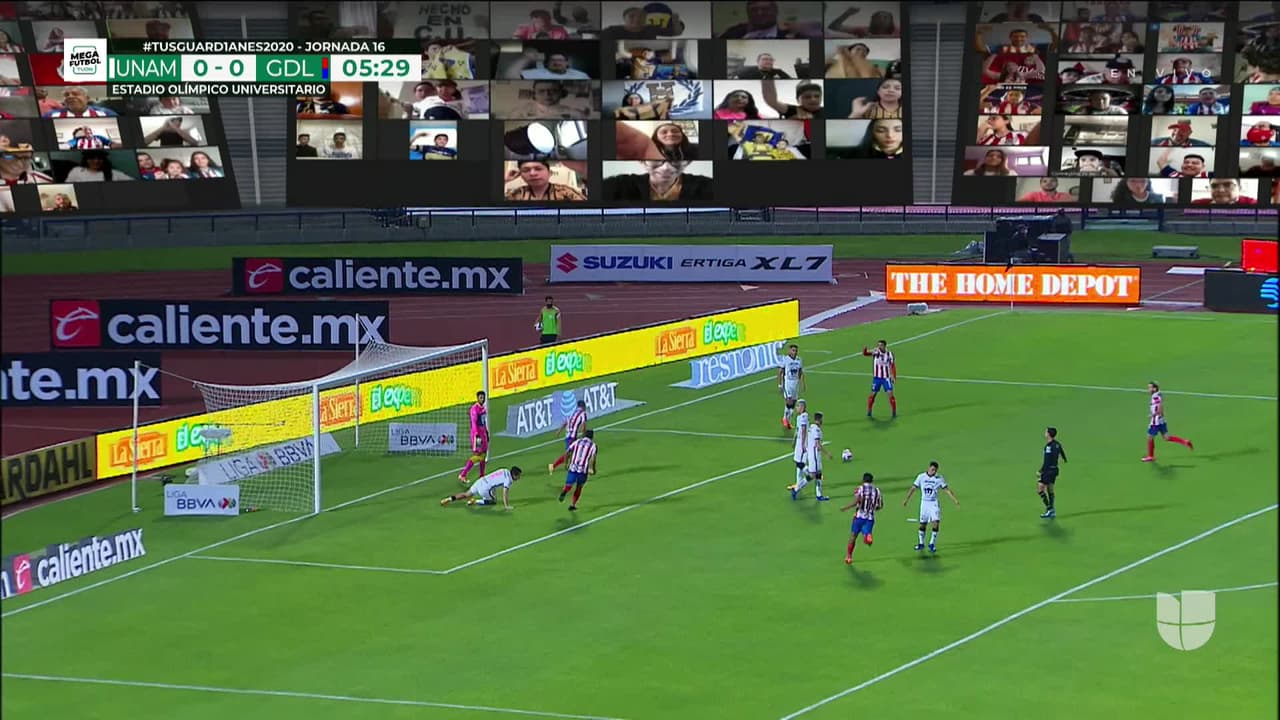 ¡Gol! Pumas UNAM 0| Chivas 1. Uriel Antuna (Chivas ) Disparo con la derecha a quemarropa desde el lado izquierdo disparo rastrero| junto al palo izquierdo. Asistencia de Isaác Brizuela.