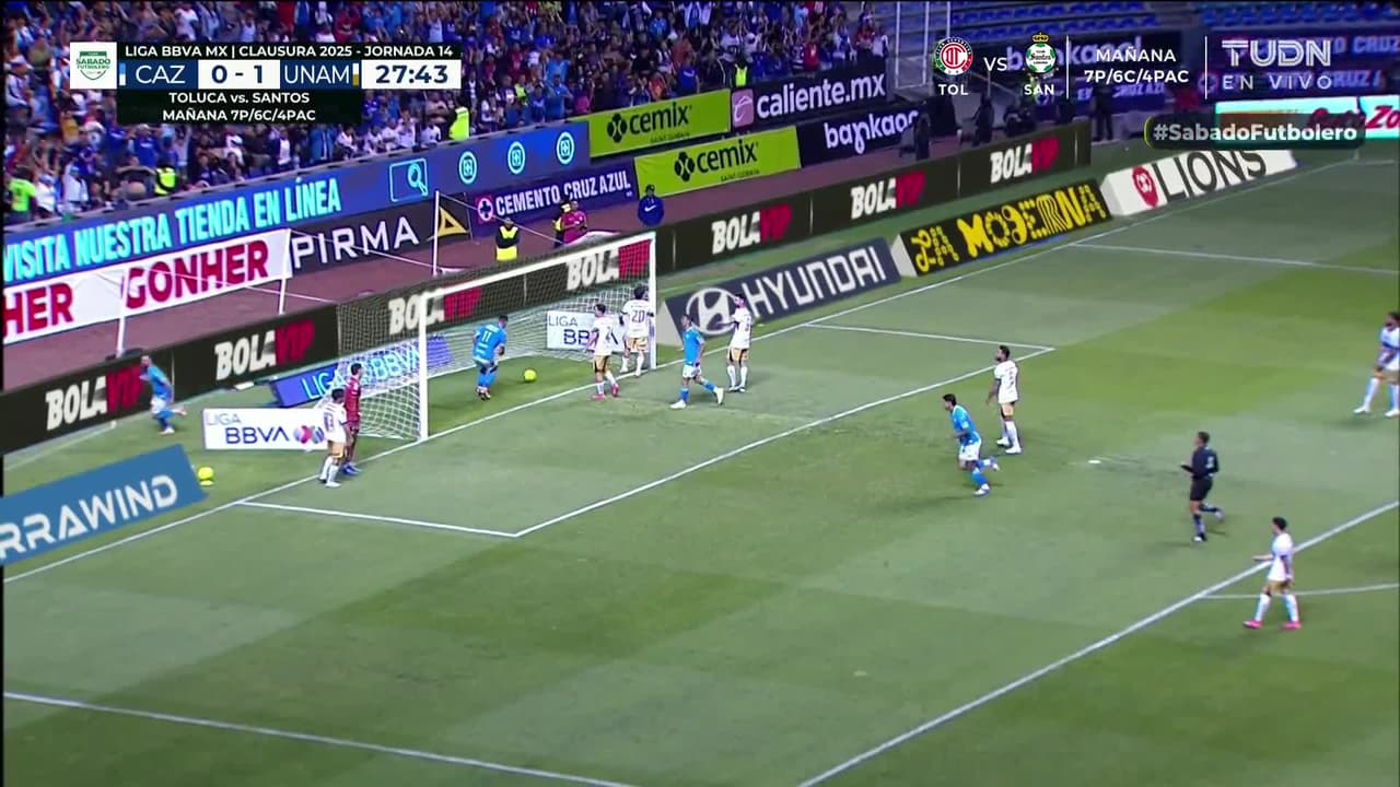 ¡Gol! Cruz Azul 1| Pumas UNAM 1. Carlos Rotondi (Cruz Azul) zurdazo a quemarropa desde el lado izquierdo disparo rastrero| junto al palo izquierdo.