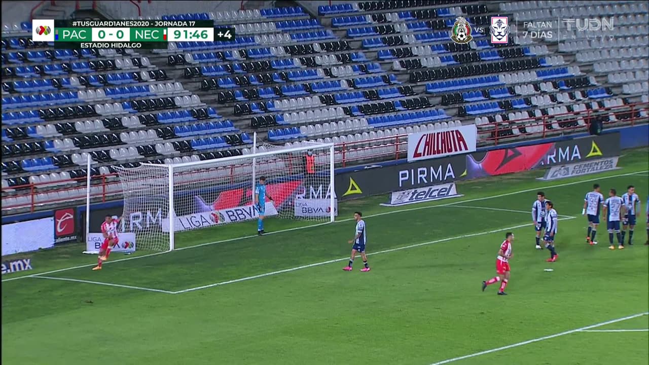 ¡Gol! Pachuca 0| Necaxa 1. David Cabrera (Necaxa) marca de tiro libre directo| zurdazo por el lado derecho de la portería.