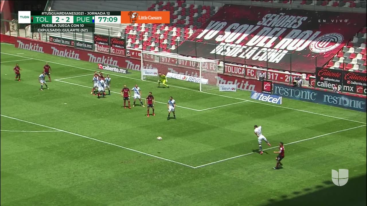 ¡Gol! Toluca 3| Puebla 2. Diego (Toluca) zurdazo desde fuera del área por arriba. Asistencia de Antonio Ríos tras un saque de esquina.