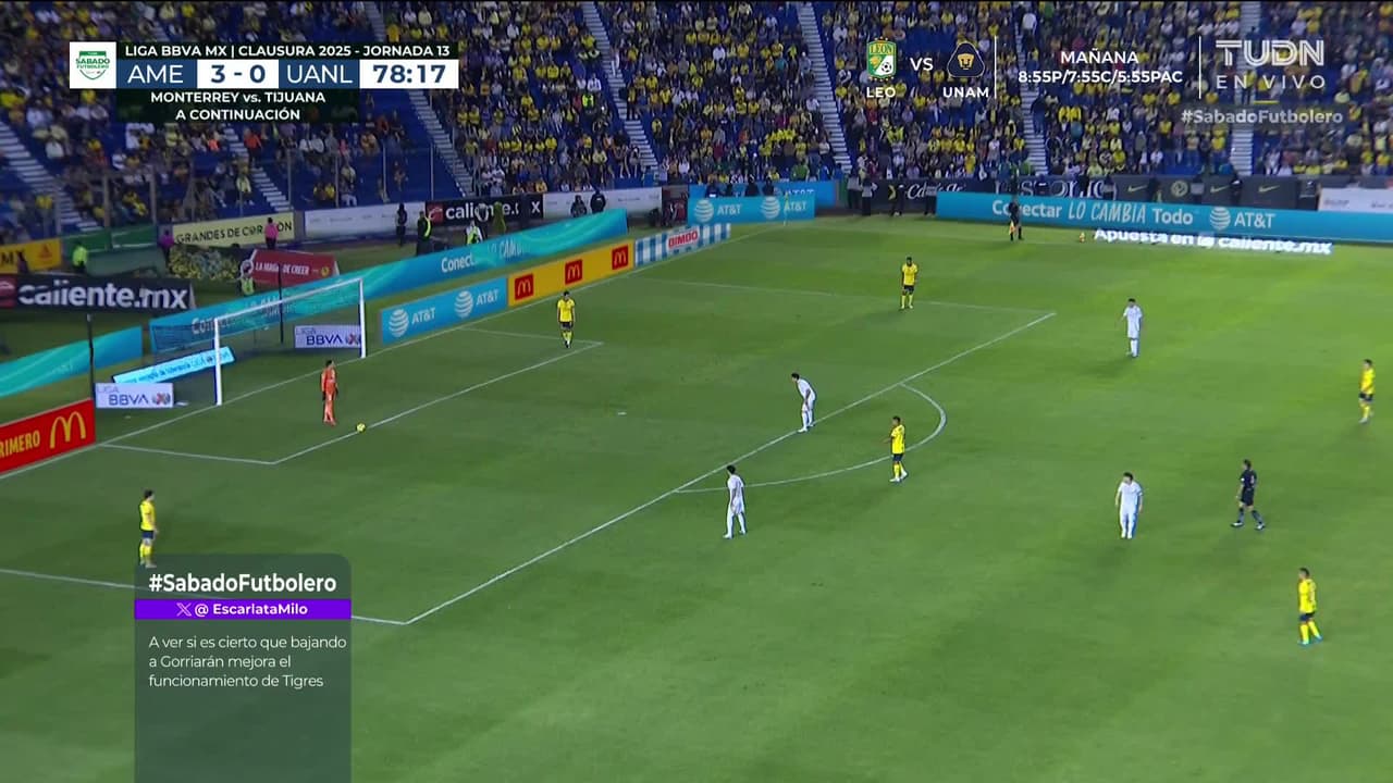 ¡Gol! América 4| Tigres 0. Diego Valdés (América) Disparo con la derecha desde el centro del área.