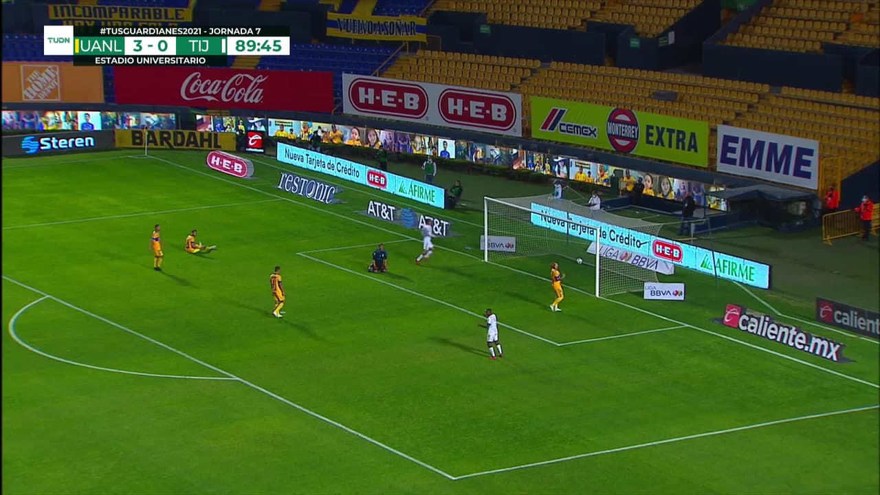 ¡Gol! Tigres 3| Club Tijuana 1. Edgar López (Club Tijuana) zurdazo desde el lado izquierdo dentro del área por arriba. Asistencia de Jordi Cortizo.