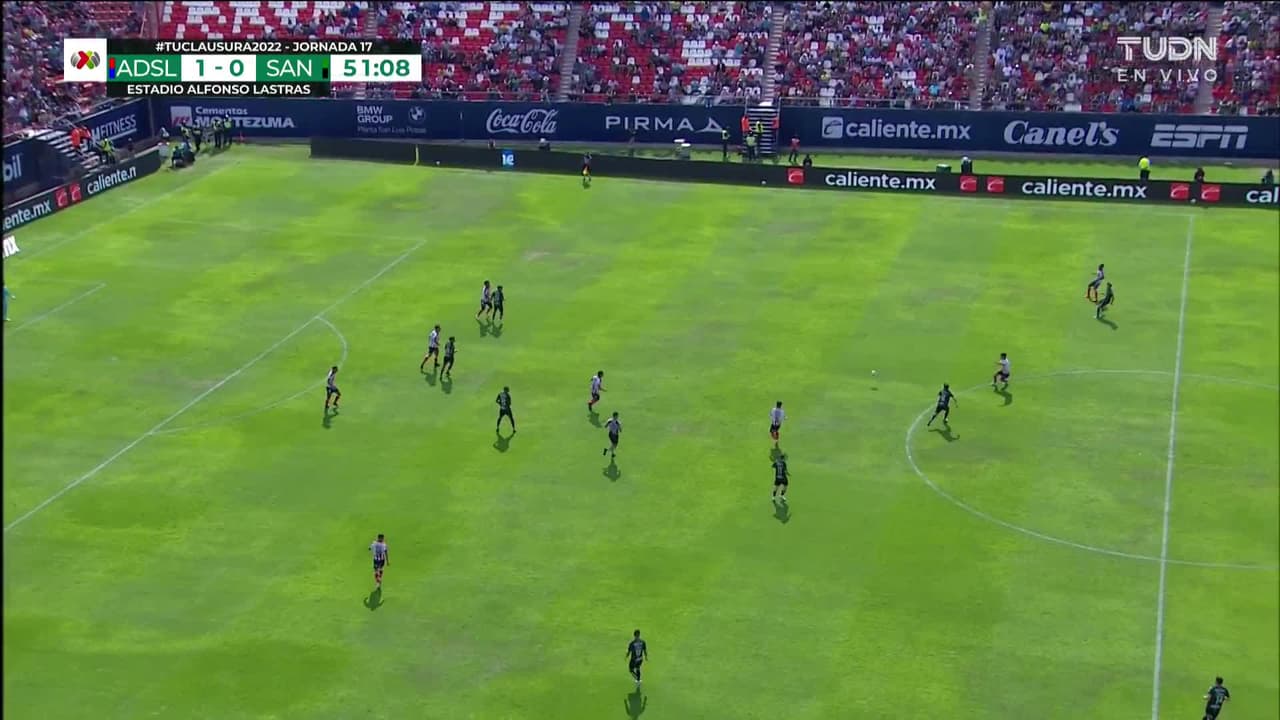 ¡Gol! Atlético San Luis 1| Santos Laguna 1. Eduardo Aguirre (Santos Laguna) Disparo con la derecha desde fuera del área disparo rastrero| junto al palo izquierdo. Asistencia de Harold Preciado.