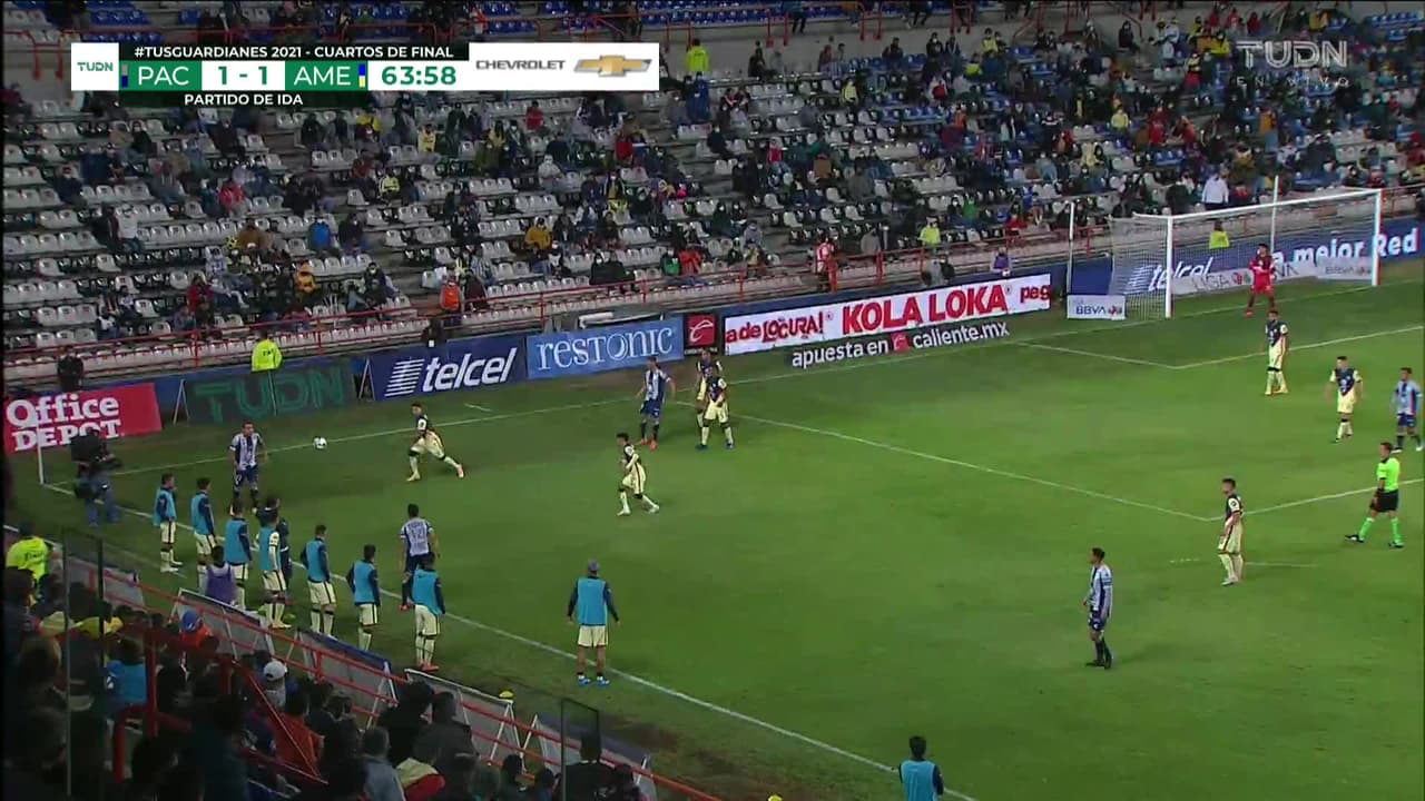 ¡Gol! Pachuca 2| América 1. Felipe Pardo (Pachuca) Disparo con la derecha desde el centro del área por arriba. Asistencia de Roberto de la Rosa.