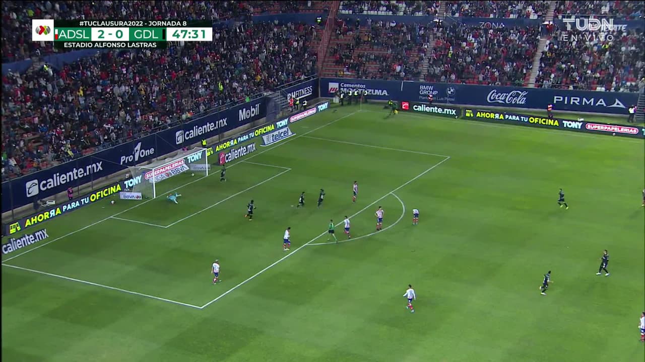 ¡Gol! Atlético San Luis 2| Chivas 1. Fernando Beltrán (Chivas ) Disparo con la derecha desde fuera del área.