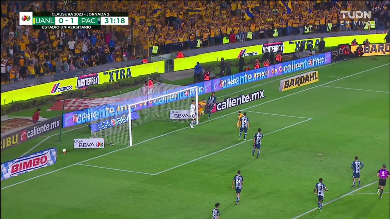 ¡Gol! Tigres 1| Pachuca 1. Fernando Gorriarán (Tigres) disparo de cabeza desde el centro del área.