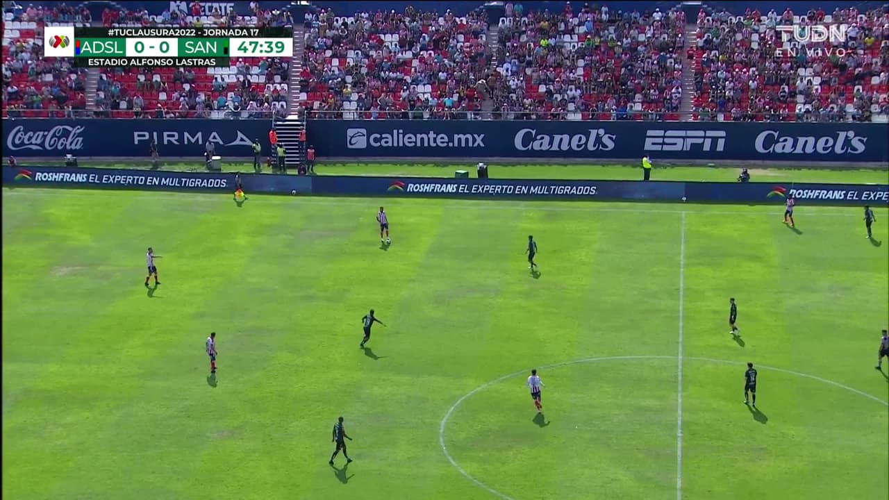 ¡Gol! Atlético San Luis 1| Santos Laguna 0. Germán Berterame (Atlético San Luis) zurdazo desde el centro del área por el lado derecho de la portería.