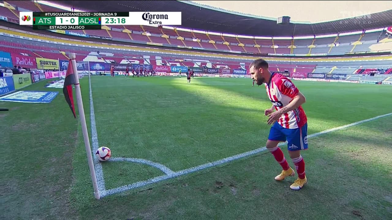 ¡Gol! Atlas 1| Atlético San Luis 1. Germán Berterame (Atlético San Luis) disparo de cabeza desde el centro del área por el lado derecho de la portería. Asistencia de Luis Felipe Gallegos con un centro al área tras un saque de esquina.