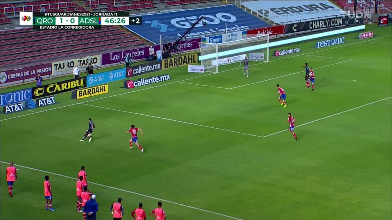 ¡Gol! Querétaro 2| Atlético San Luis 0. Hugo Silveira (Querétaro) disparo de cabeza desde el centro del área al ángulo superior izquierdo. Asistencia de Jefferson Montero con un centro al área.