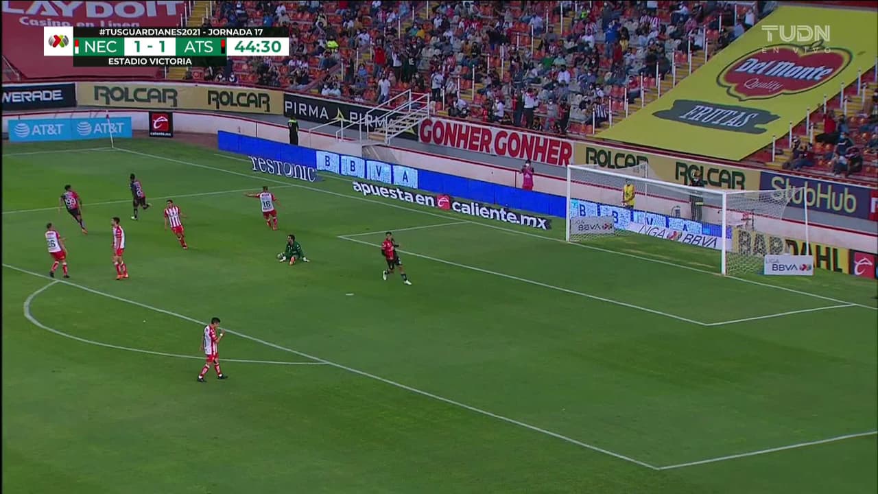 ¡Gol! Necaxa 1| Atlas 2. Jairo Torres (Atlas) zurdazo desde el centro del área al centro de la portería.