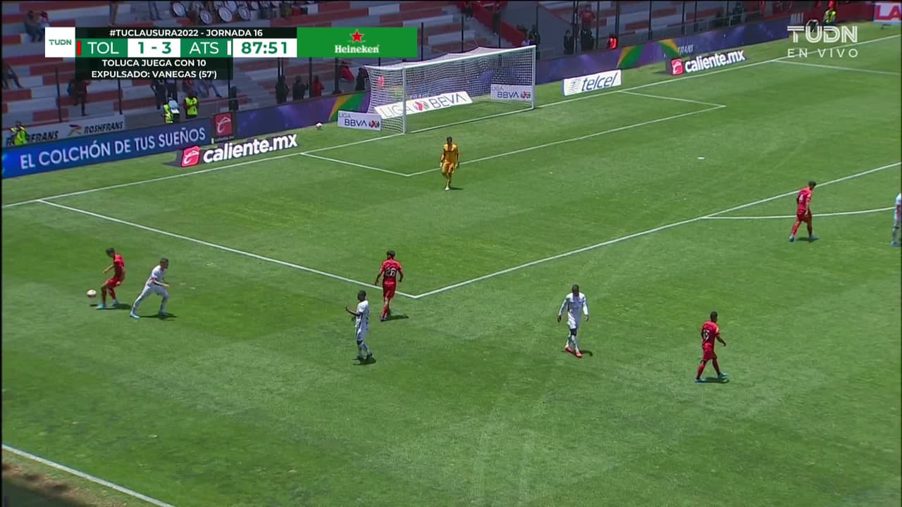 ¡Gol! Toluca 2| Atlas 3. Isaías Violante (Toluca) zurdazo desde el lado izquierdo dentro del área.