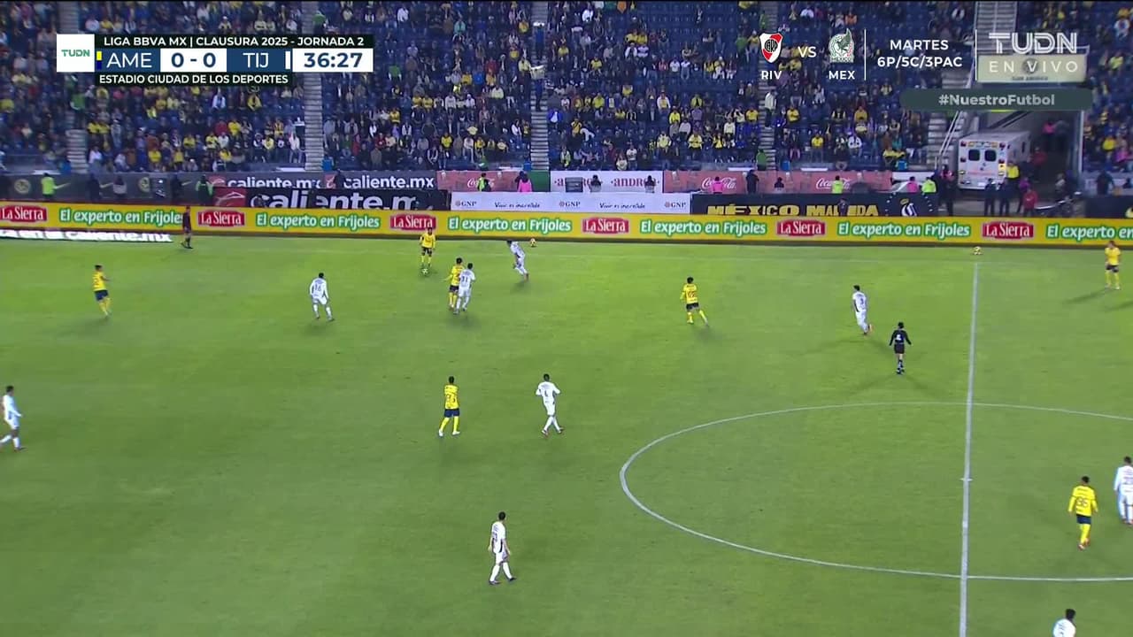 ¡Gol! América 0| Club Tijuana 1. Jesús Hernández (Club Tijuana) Disparo con la derecha desde el centro del área.