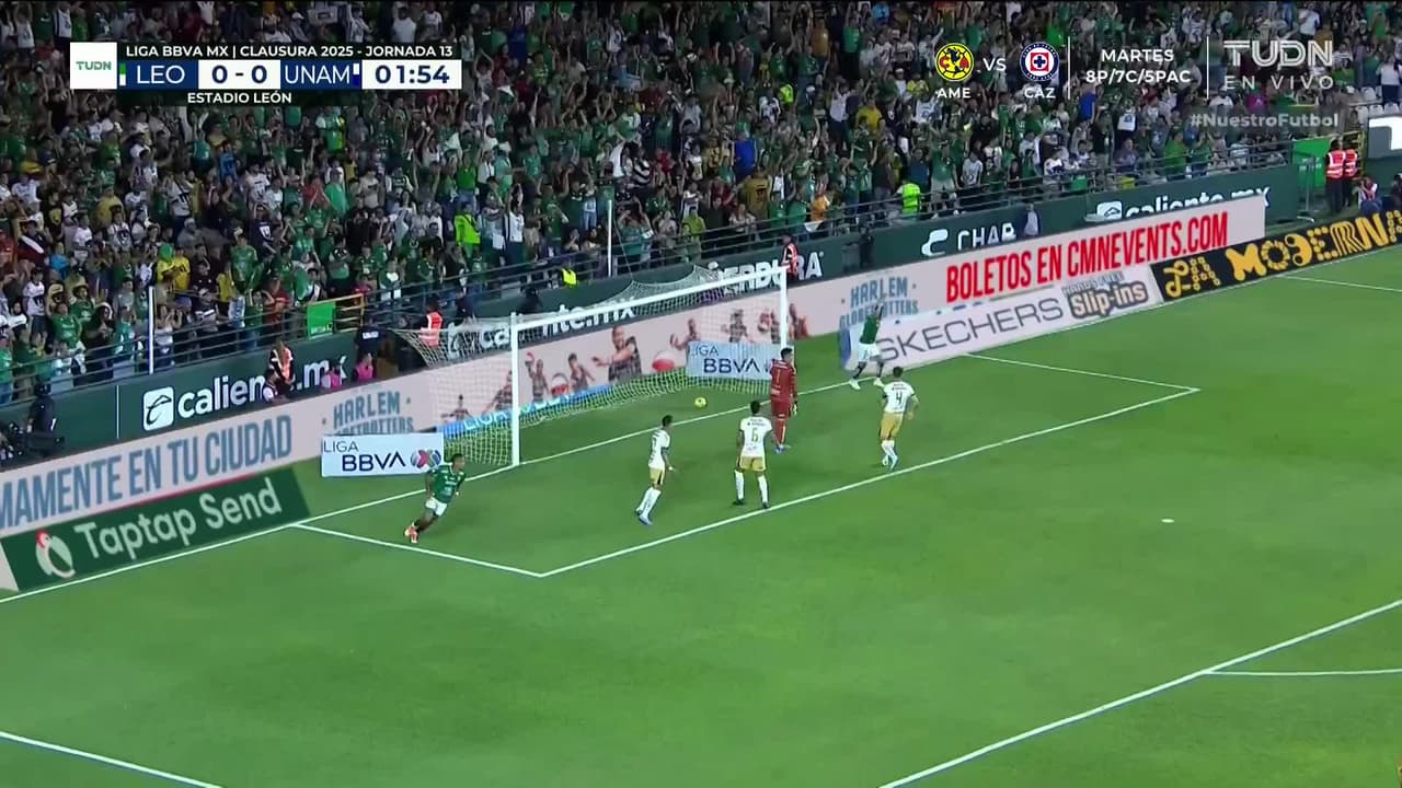 ¡Gol! León 1| Pumas UNAM 0. Jhonder Cádiz (León) Disparo con la derecha desde el centro del área.
