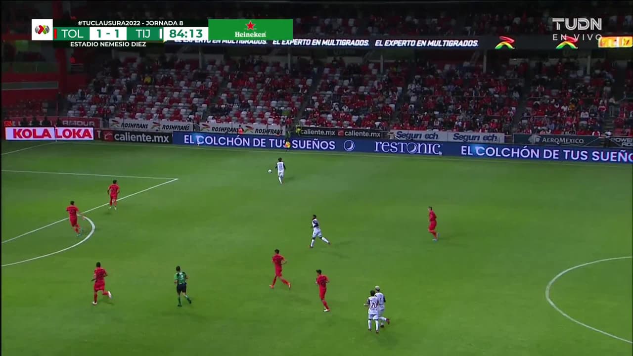 ¡Gol! Toluca 1| Club Tijuana 2. Joaquín Montecinos (Club Tijuana) Disparo con la derecha a quemarropa desde el lado derecho.