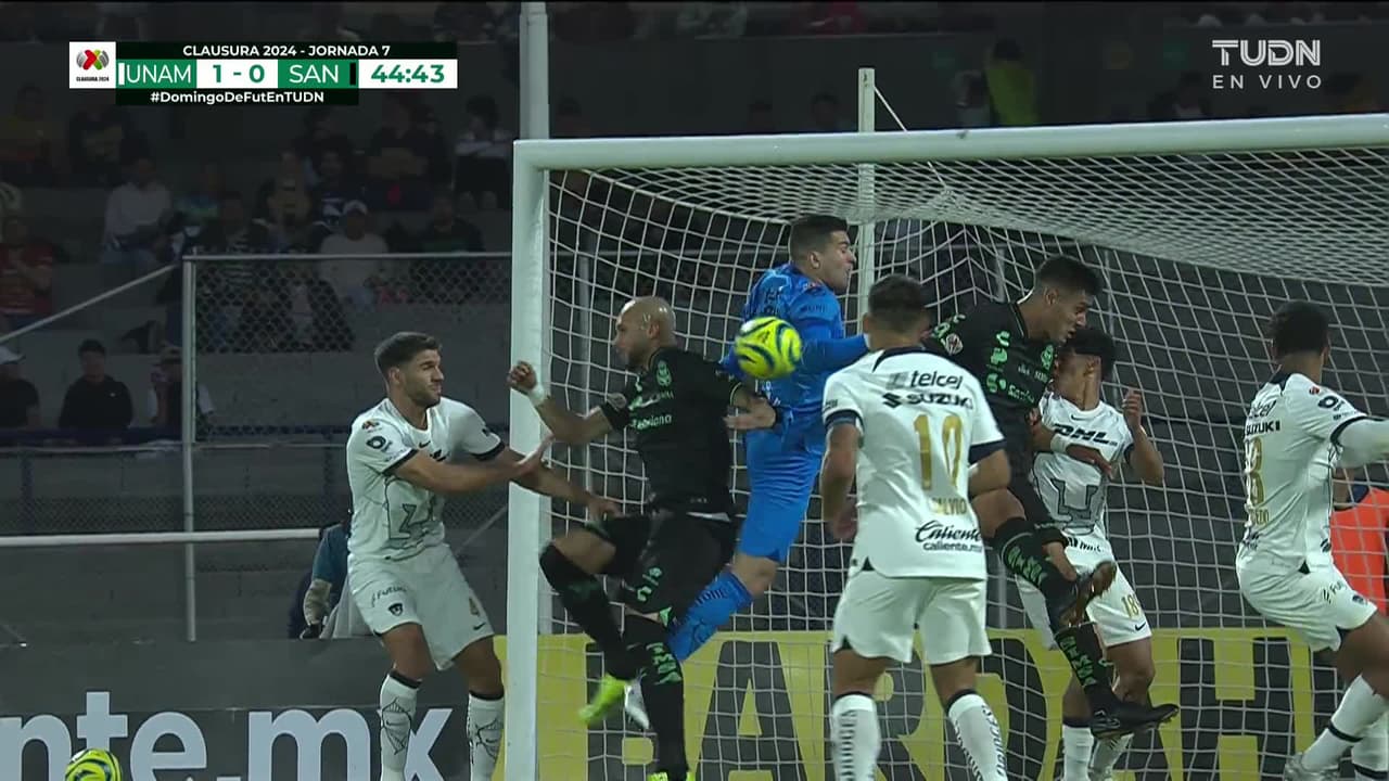 ¡Gol! Pumas UNAM 2| Santos Laguna 0. José Caicedo (Pumas UNAM) disparo de cabeza desde el centro del área tras un saque de esquina.