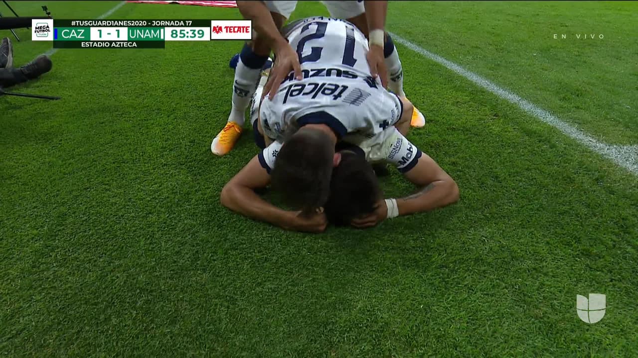 ¡Gol! Cruz Azul 1| Pumas UNAM 1. Juan Ignacio Dinenno (Pumas UNAM) disparo de cabeza desde el centro del área por el lado derecho de la portería. Asistencia de Juan Vigón con un centro al área.