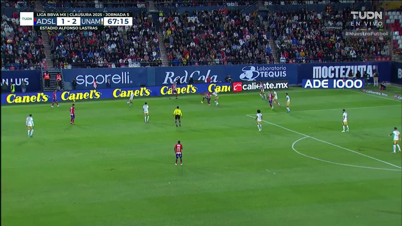 ¡Gol! Atlético San Luis 2| Pumas UNAM 2. Juan Manuel Sanabria (Atlético San Luis) Disparo con la derecha a quemarropa desde el lado izquierdo.