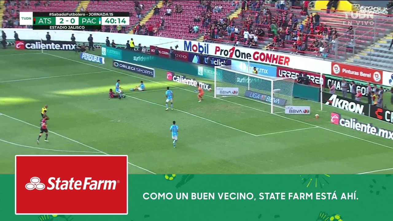 ¡Gol! Atlas 3| Pachuca 0. Julián Quiñones (Atlas) Disparo con la derecha desde el centro del área.