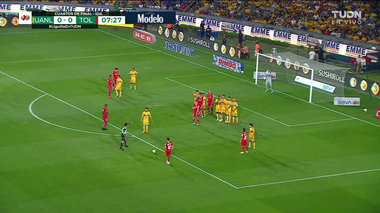 ¡Gol! Tigres 0| Toluca 1. Leonardo Fernández (Toluca) marca de tiro libre directo| zurdazo por el lado derecho de la portería.