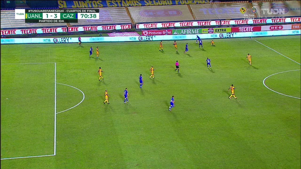 ¡Gol! Tigres 1| Cruz Azul 3. Luis Romo (Cruz Azul) Disparo con la derecha a quemarropa desde el lado derecho por arriba. Asistencia de Orbelín Pineda.