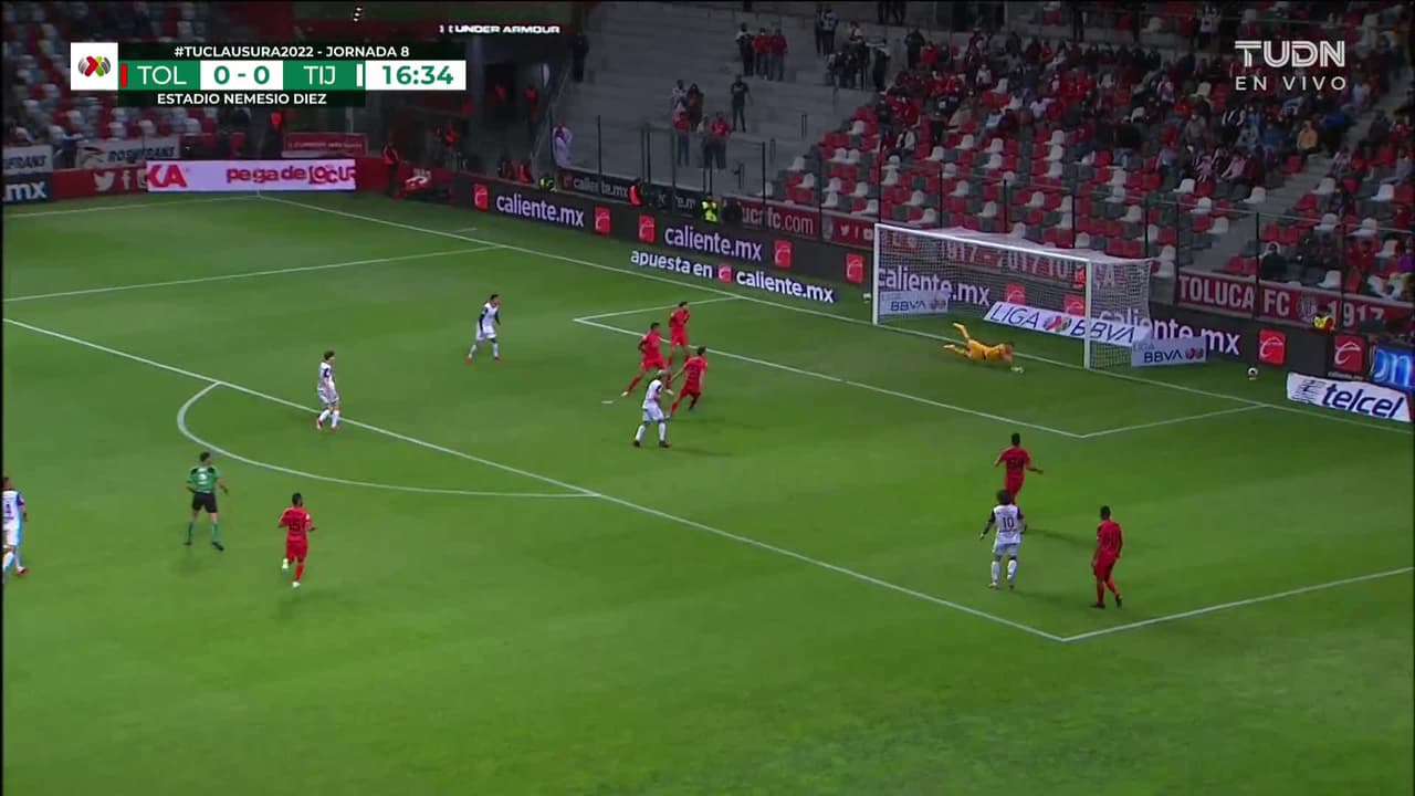 ¡Gol! Toluca 0| Club Tijuana 1. Marcel Ruiz (Club Tijuana) Disparo con la derecha desde fuera del área.