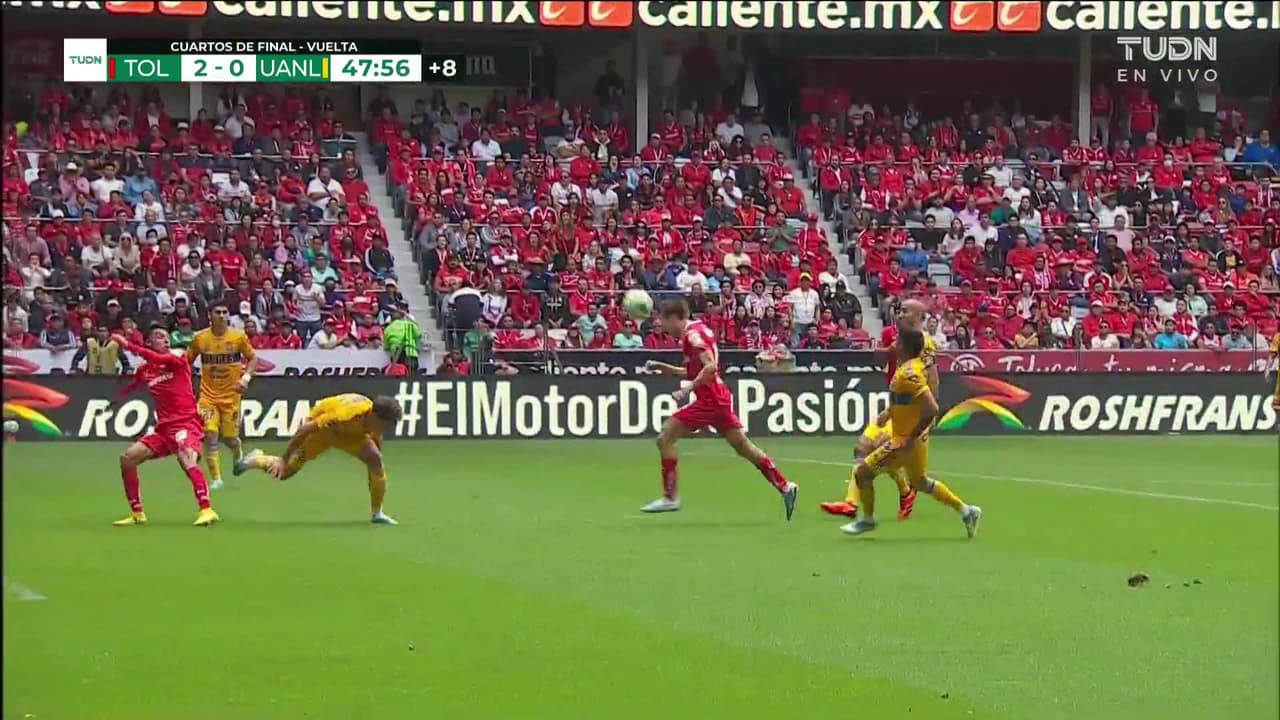 ¡Gol! Toluca 2| Tigres 0. Marcel Ruiz (Toluca) disparo de cabeza desde el centro del área al ángulo superior izquierdo.