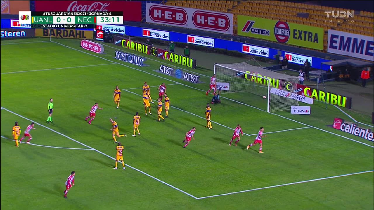 ¡Gol! Tigres 0| Necaxa 1. Martín Barragán (Necaxa) disparo de cabeza desde el centro del área tras un saque de esquina.