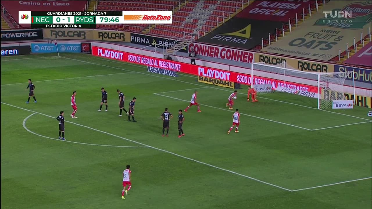 ¡Gol! Necaxa 1| Monterrey 1. Martín Barragán (Necaxa) zurdazo desde el centro del área disparo rastrero| junto al palo izquierdo.
