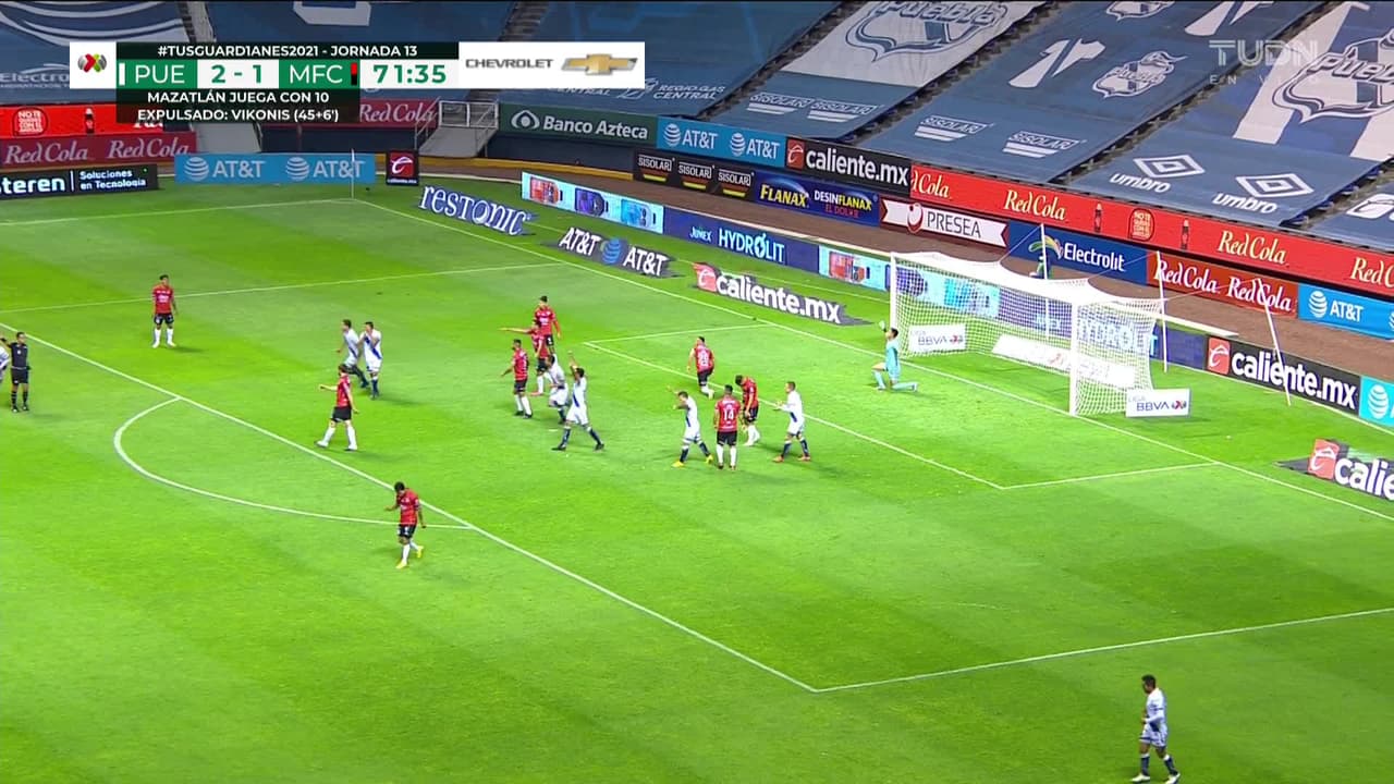 ¡Gol! Puebla 3| Mazatlán FC 1. Maximiliano Araujo (Puebla) zurdazo desde el lado izquierdo dentro del área al centro de la portería tras un saque de esquina.