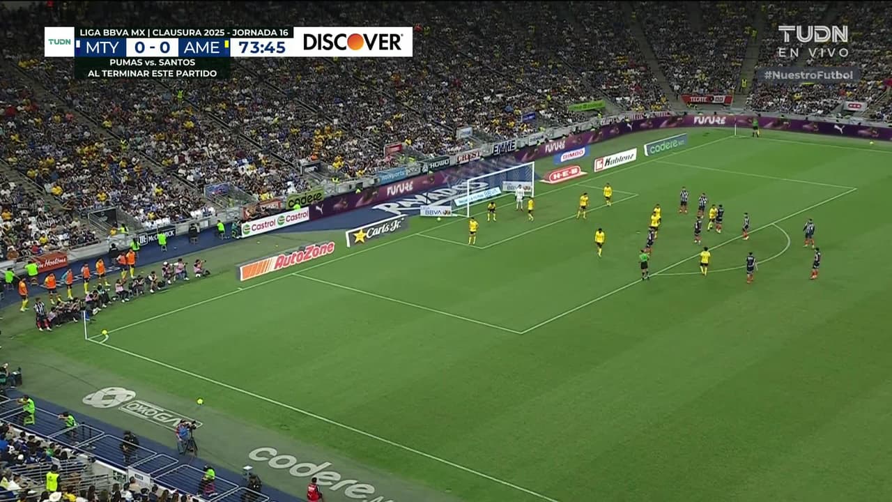 ¡Gol! Monterrey 1| América 0. Nelson Deossa (Monterrey) zurdazo desde fuera del área tras un saque de esquina.