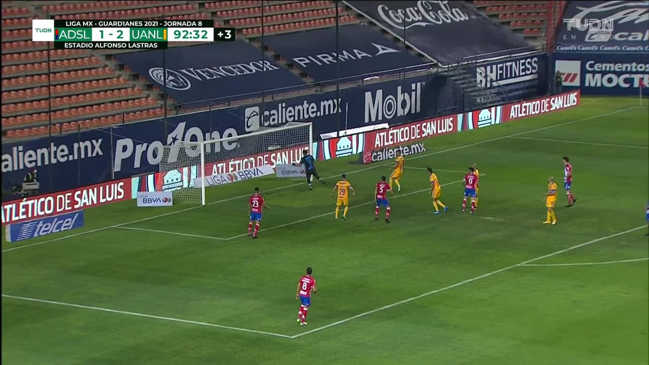¡Gol! Atlético San Luis 2| Tigres 2. Nicolás Ibáñez (Atlético San Luis) disparo de cabeza desde el centro del área por arriba. Asistencia de Damián Batallini con un centro al área.