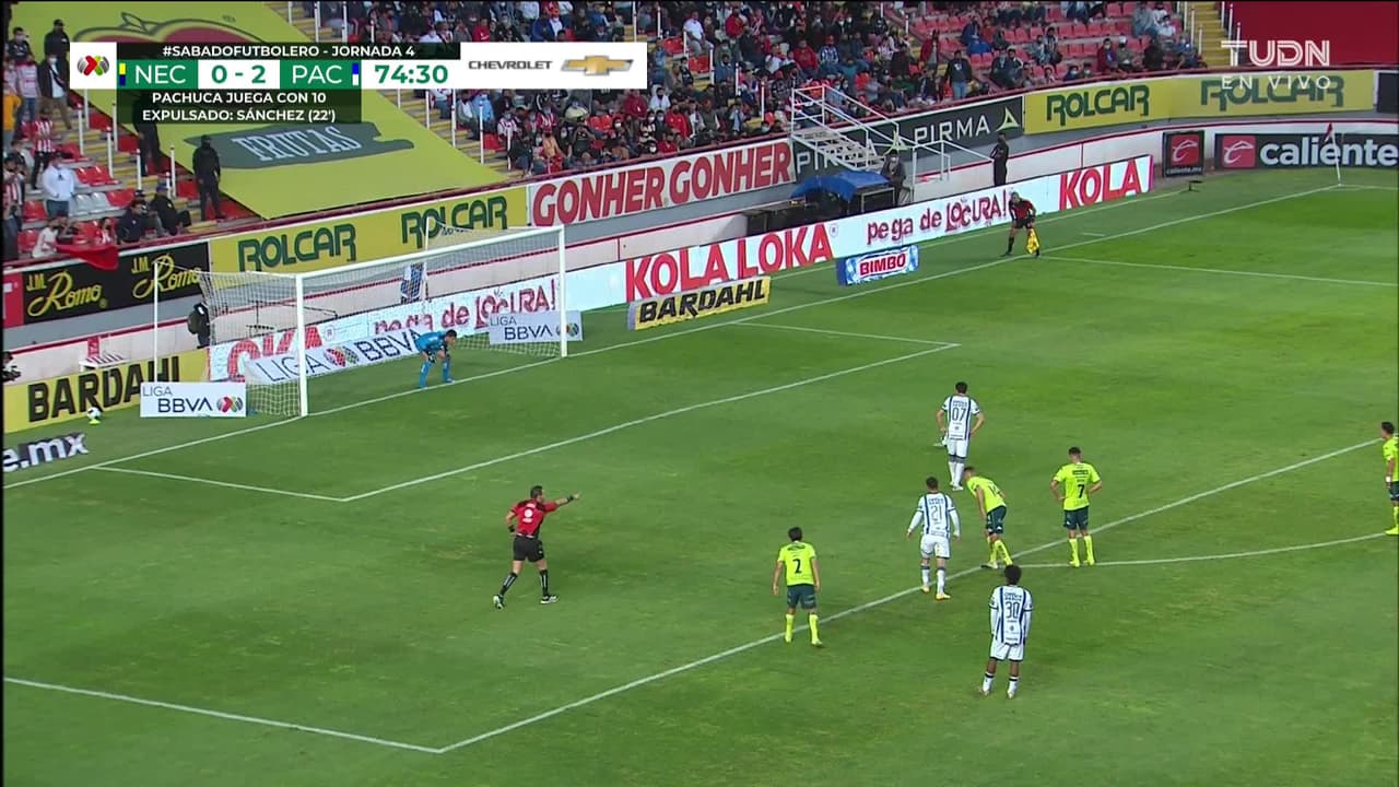 ¡Gol! Necaxa 0| Pachuca 3. Nicolás Ibáñez (Pachuca) convirtió el penalti Disparo con la derecha disparo rastrero| junto al palo izquierdo.