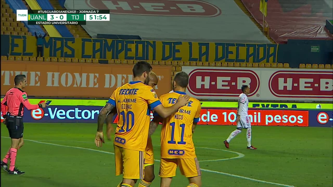 ¡Gol! Tigres 3| Club Tijuana 0. Nicolás López (Tigres) zurdazo a quemarropa desde el lado izquierdo disparo rastrero| junto al palo izquierdo.