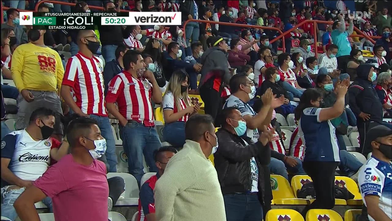 ¡Gol! Pachuca 1| Chivas 1. Óscar Murillo (Pachuca) disparo de cabeza desde el centro del área por el lado derecho de la portería. Asistencia de Ismael Sosa con un centro al área tras un saque de esquina.