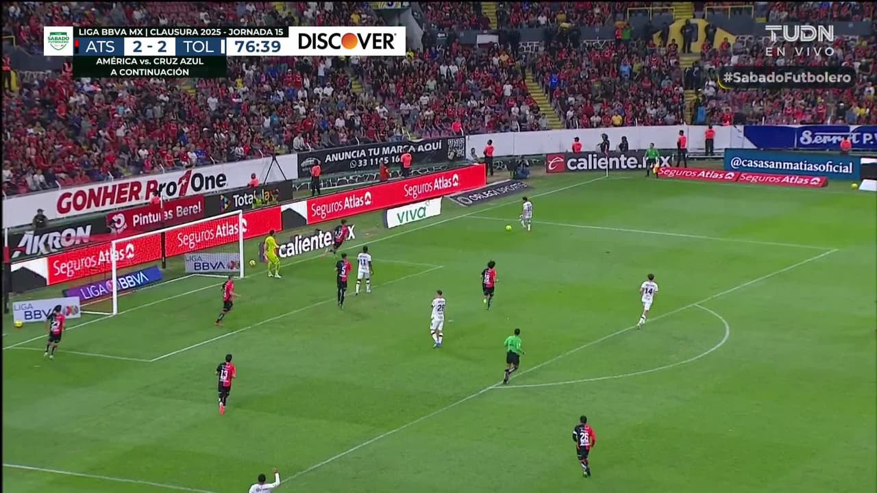 ¡Gol! Atlas 2| Toluca 3. Paulinho (Toluca) disparo de cabeza desde el centro del área disparo rastrero| junto al palo izquierdo. Asistencia de Jesús Angulo con un centro al área.