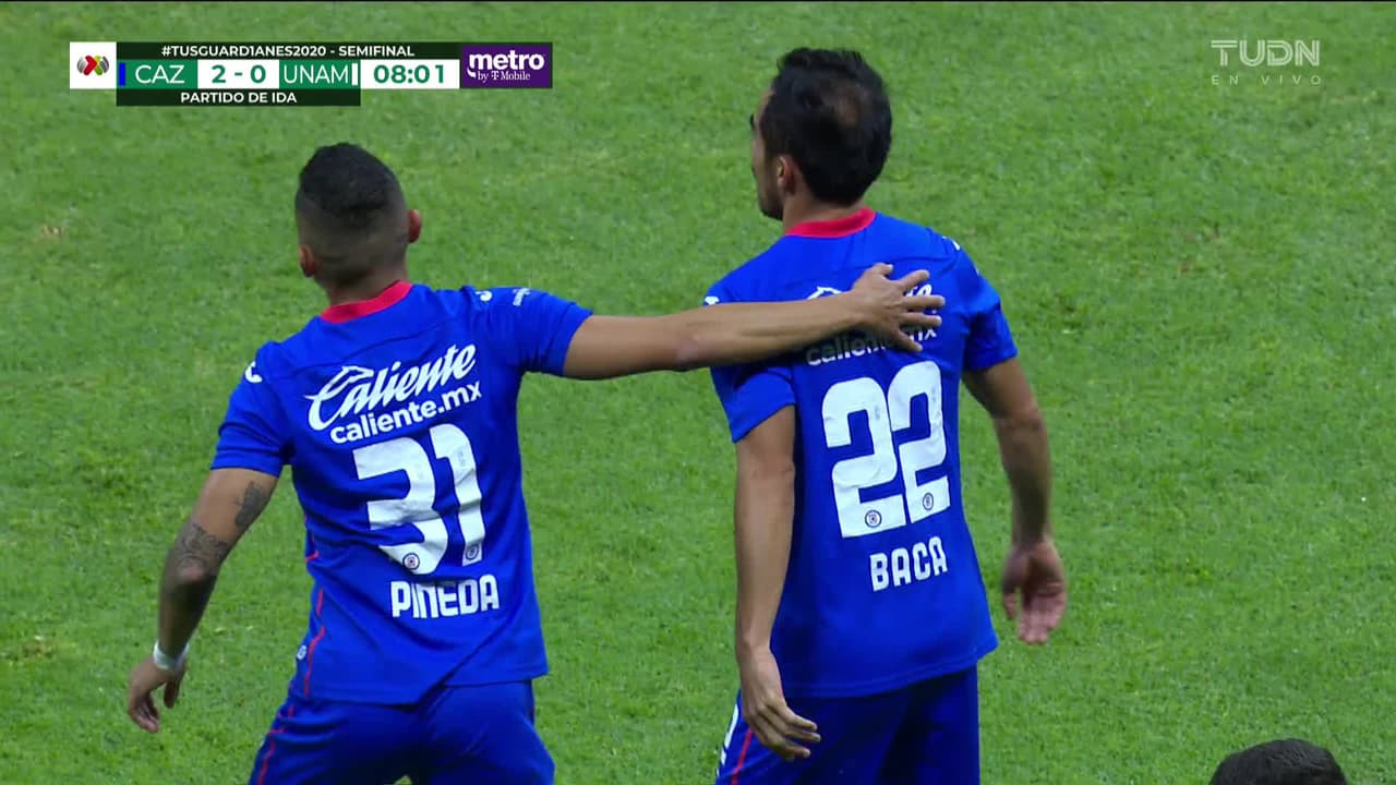 ¡Gol! Cruz Azul 2| Pumas UNAM 0. Rafael Baca (Cruz Azul) Disparo con la derecha desde fuera del área por arriba.