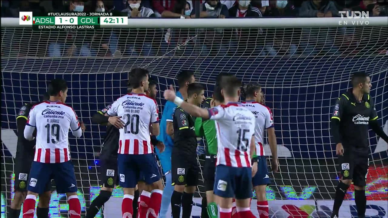 ¡Gol! Atlético San Luis 2| Chivas 0. Ramón Juárez (Atlético San Luis) disparo de cabeza desde el centro del área tras un saque de esquina.