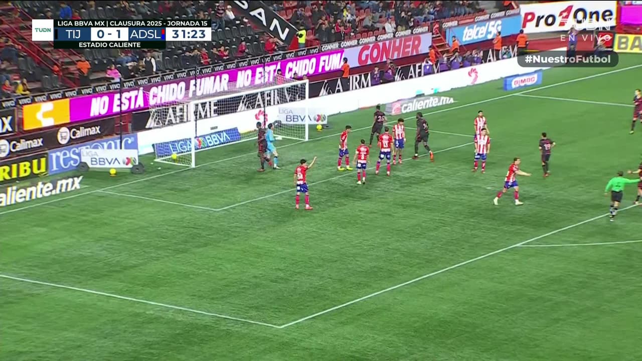 ¡Gol! Club Tijuana 1| Atlético San Luis 1. Raúl Zúñiga (Club Tijuana) Disparo con la derecha desde el centro del área tras un saque de esquina.