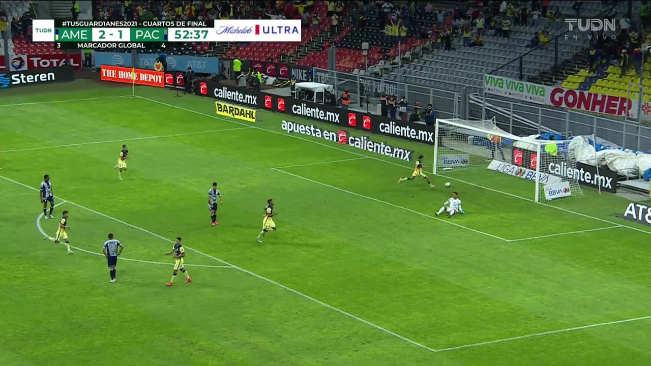 ¡Gol! América 3| Pachuca 1. Roger Martínez (América) Disparo con la derecha desde fuera del área por el lado derecho de la portería. Asistencia de Henry Martín.