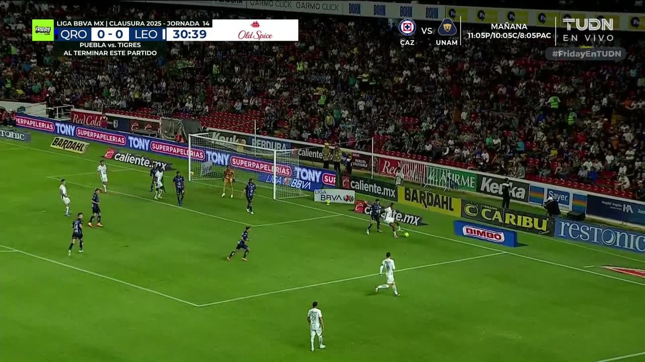 ¡Gol! Querétaro 0| León 1. Salvador Reyes (León) zurdazo a quemarropa desde el lado izquierdo.